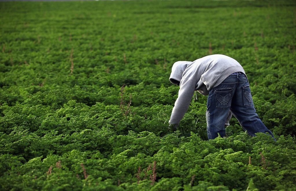 A Mexican immigrant worker bends over to harvest parsley in the middle of a field on a farm.