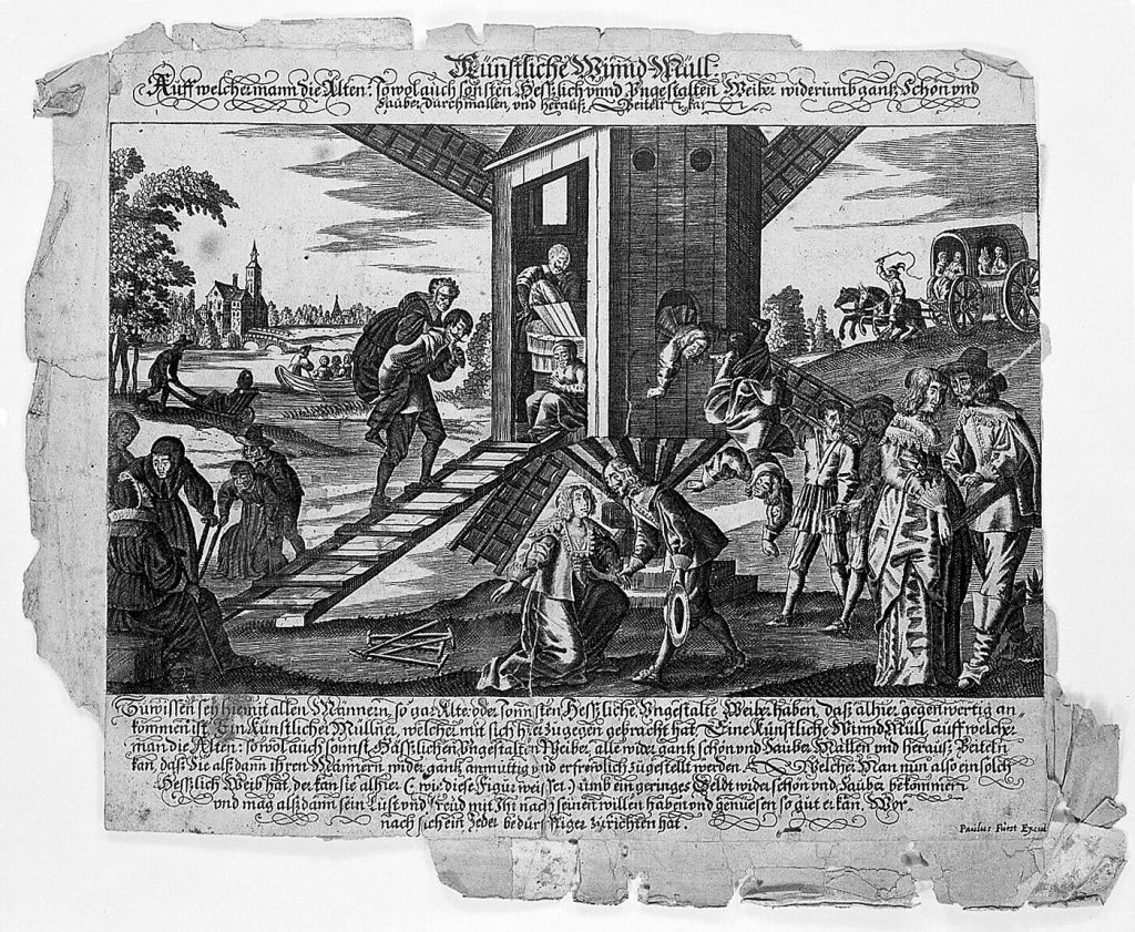 An illustration from the mid-1600s depicts an alleged Dutch invention to help unhappy husbands: a windmill to transform ugly wives into beautiful ones.