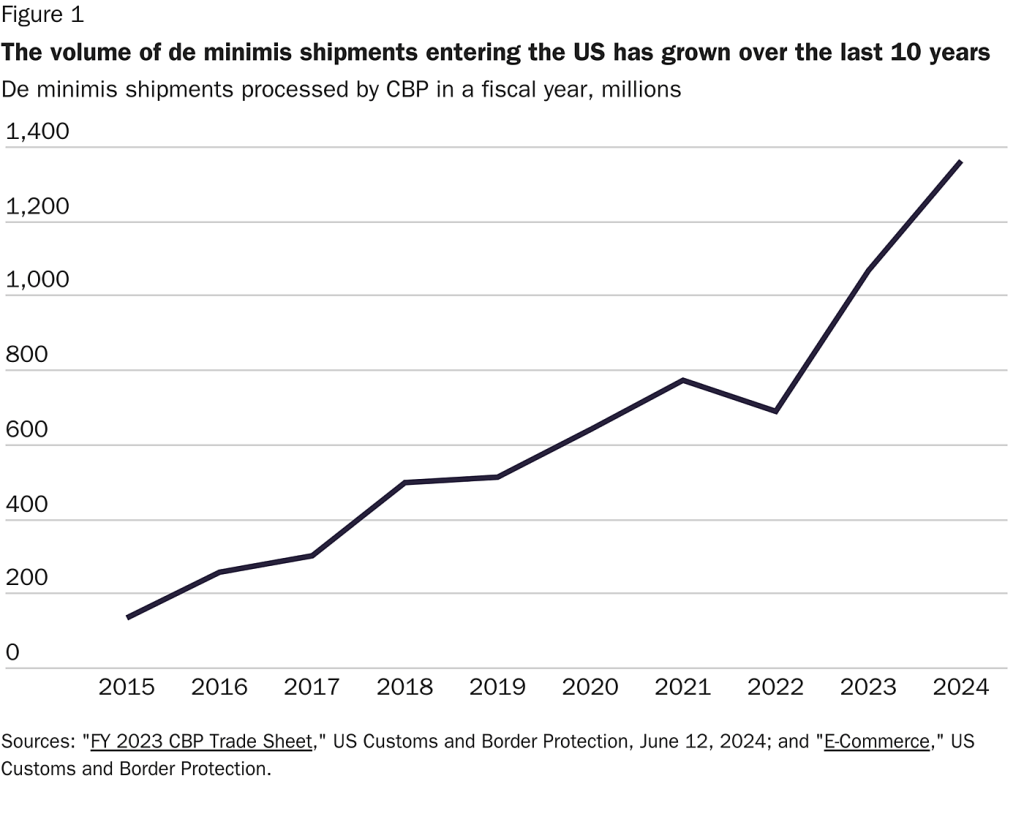Line chart showing that the volume of de minimis shipments entering the US has grown over the last 10 years