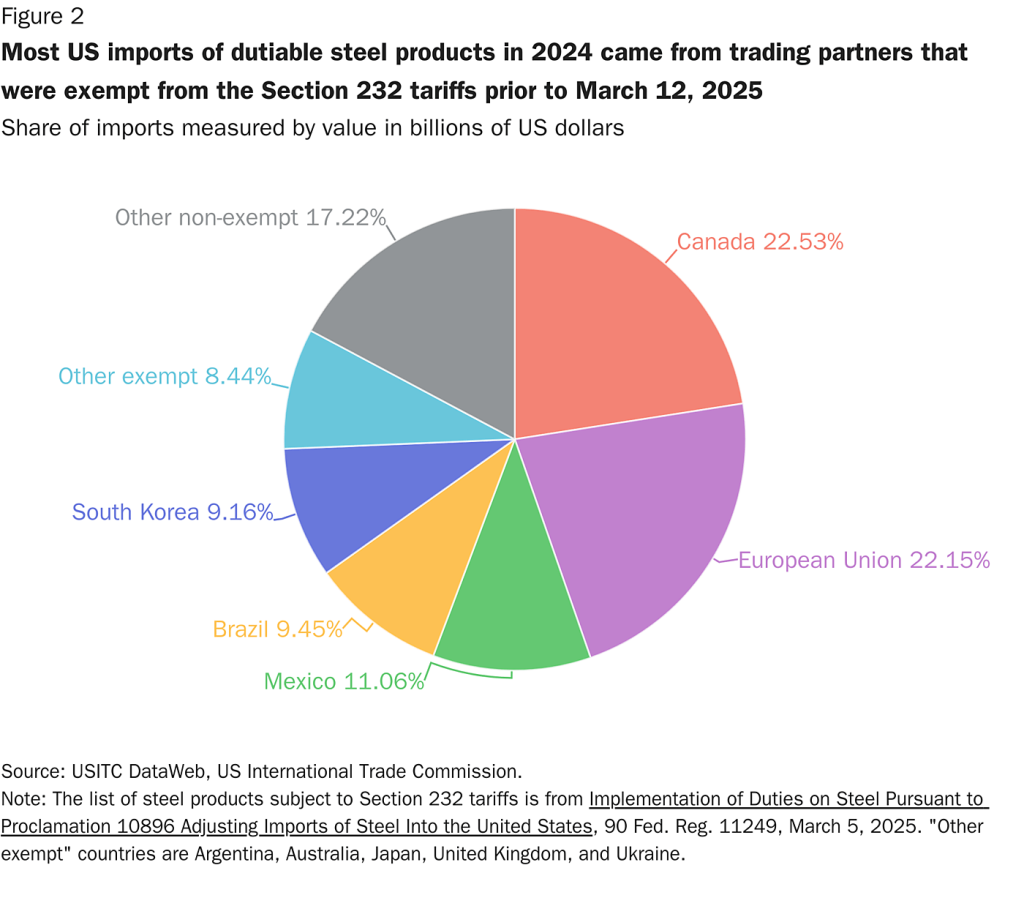 Most US imports of dutiable steel products in 2024 came from trading partners that were exempt from the Section 232 tariffs prior to March 12, 2025