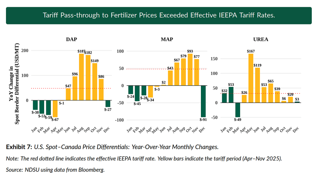 Screenshot of NDSU study graphics showing tariff pass-through rates exceeding the effective IEEPA tariff rates