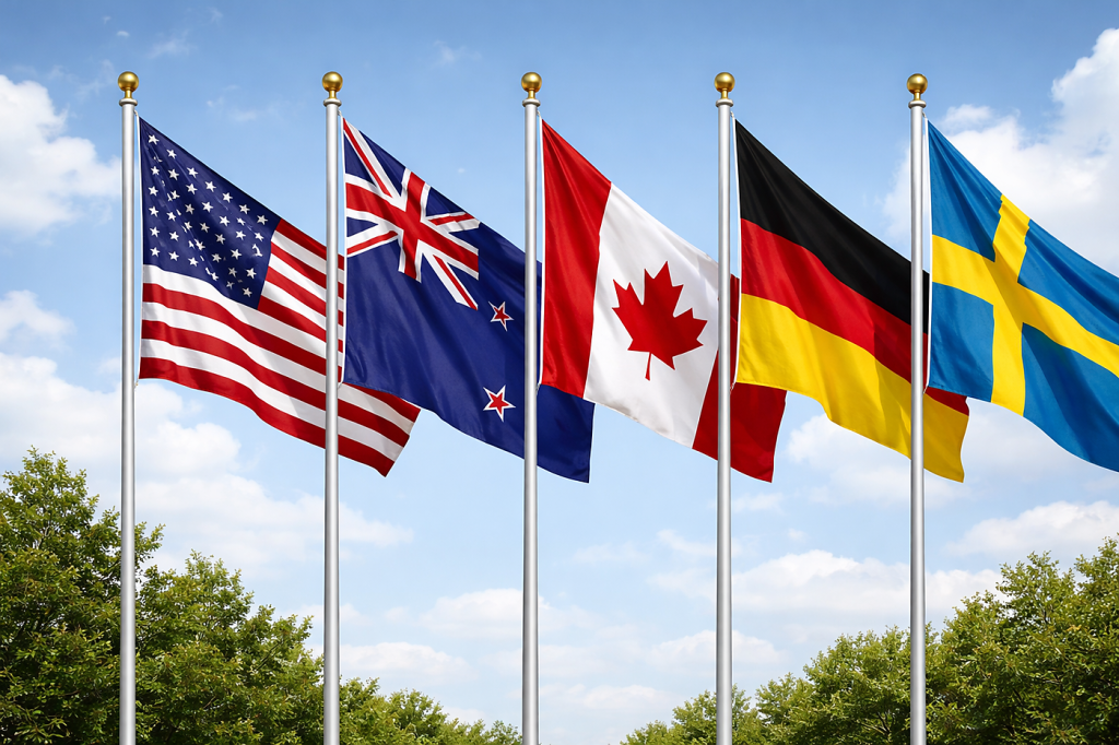 The flags of the United States, Canada, Germany, New Zealand, and Sweden