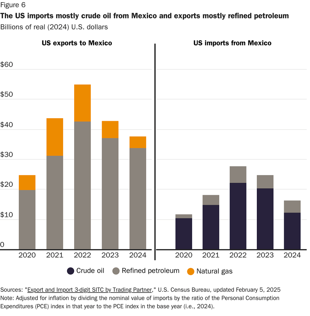 The US imports mostly crude oil from Mexico and exports mostly refined petroleum